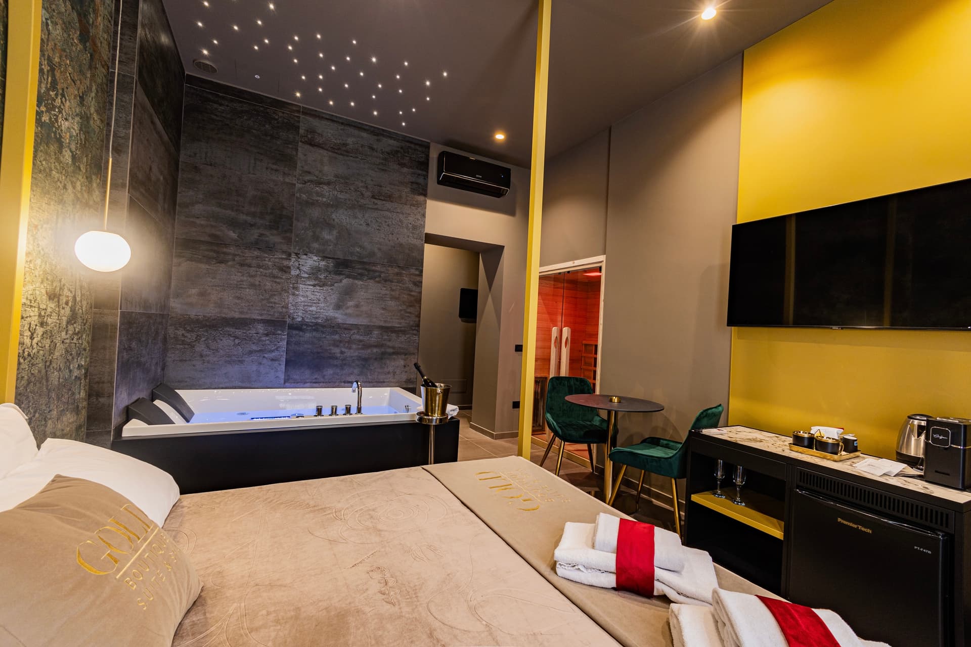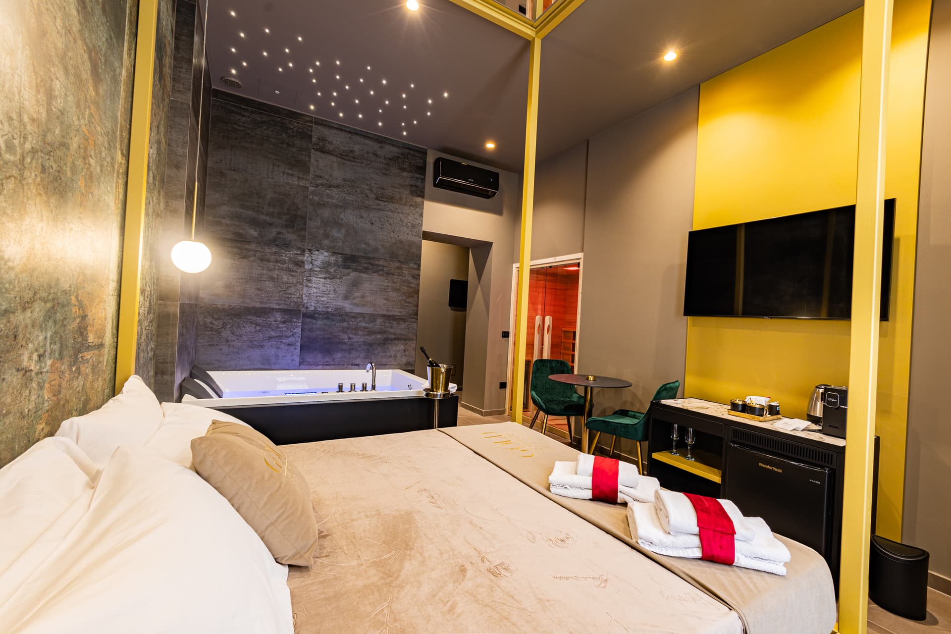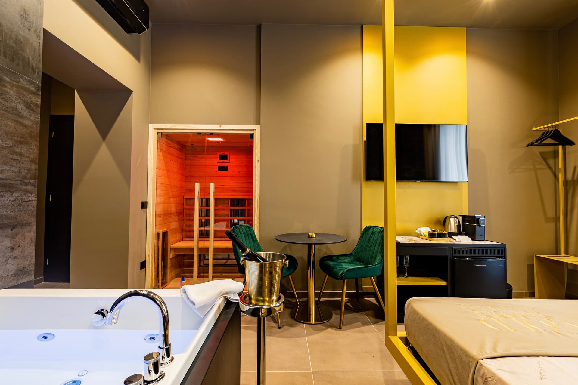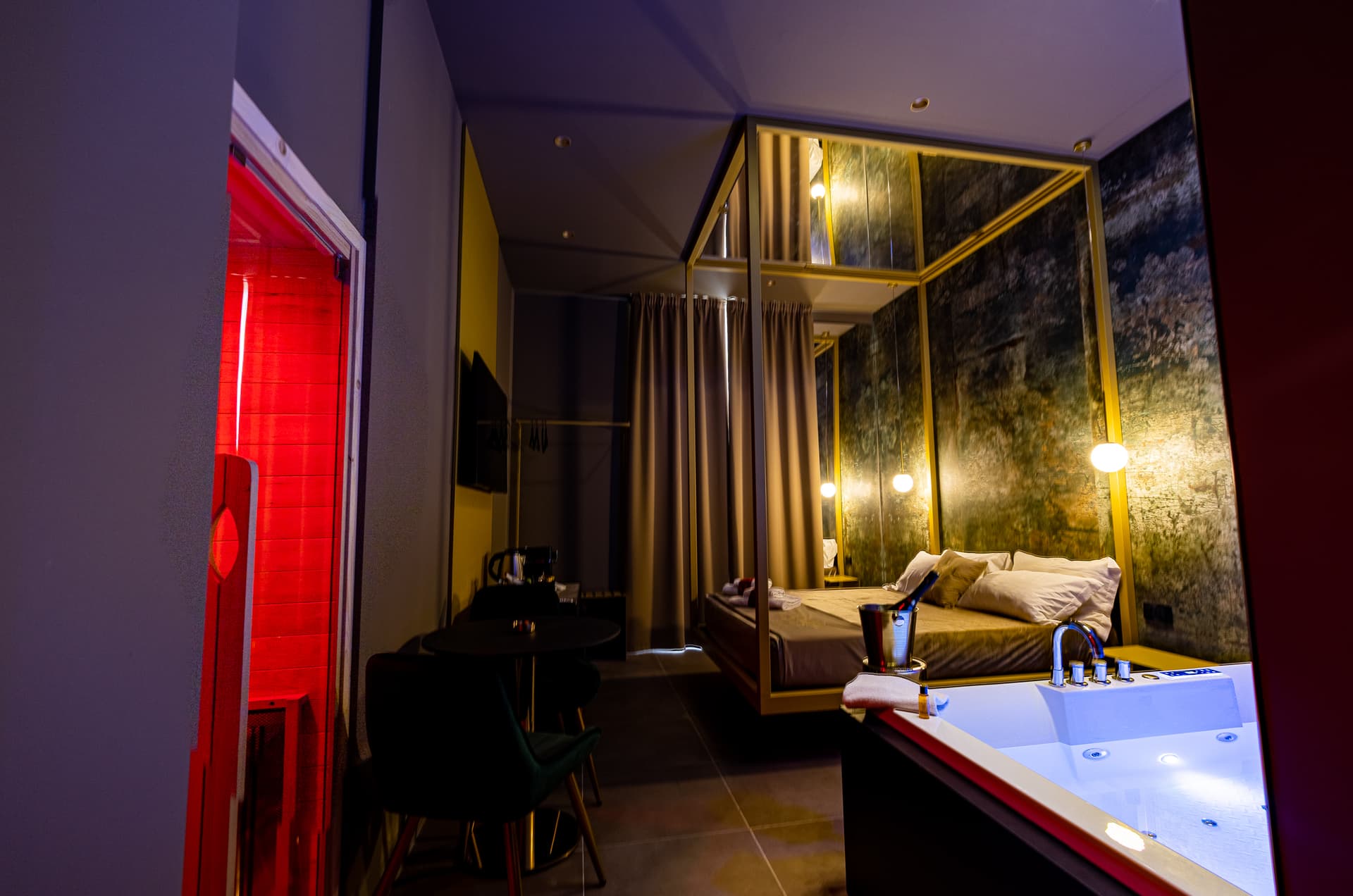 Un’atmosfera rilassante e naturale caratterizza la Green Suite, pensata per chi desidera ritrovare armonia e benessere. Dotata di vasca idromassaggio, sauna e cromoterapia, questa suite offre un’esperienza rigenerante.